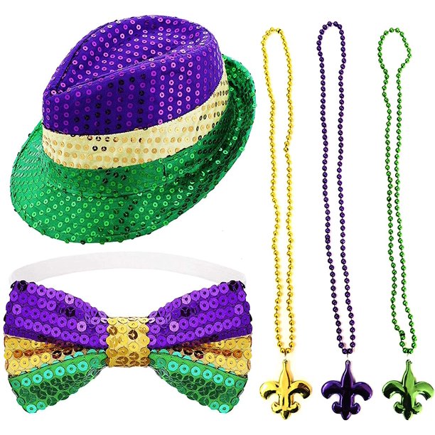 5 Pieces Mardi Gras Hat And Sequin Bow Tie Set With Colorful Bead Necklace Sequin Fedora Hat Mardi Gras Costume For Party Decoration Supplies Walmart Com